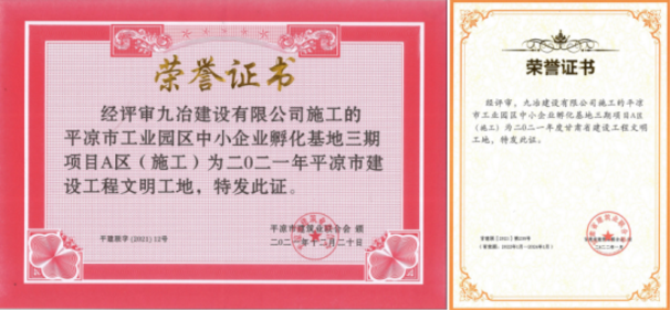 2022-03-02近日,平凉市建筑业联合会三届四次会议圆满召开,会议宣布了2021年度平凉市建设工程“三优一文明”获奖项目并颁发了省市级建设工程获奖荣誉证书,bevictor伟德承建的平凉工业园区中小企业孵化基地(三期)项目A区获评“平凉市建设工程文明工地”和“甘肃省建设工程文