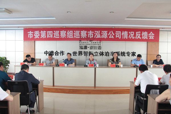 2019-07-192019年7月18日上午,市委第四巡察组巡察平凉泓源公司反馈会在甘肃泓源麦迪迈智能立体停车有限责任公司3楼会议室召开。市委巡察办主任赵玖梅,市纪委常委、市监委委员、正县级纪检监察员宋红妍,市纪委监委派驻市农牧局纪检监察组组长刘刚出席会议并